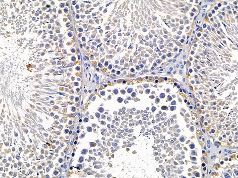 - Immunohistochemistry analysis of GCP2 in rat testis tissue. The sample was formaldehyde fixed and a heat mediated antigen retrieval step in citrate buffer was performed. Samples were incubated with GCP2 polyclonal antibody (Product # PA5-103851) using a dilution of 1:100 (4°C overnight) followed by HRP conjugated anti-Rabbit secondary antibody.