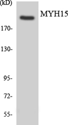 - Western blot analysis of MYH15 Antibody. The lane on the right is blocked with the MYH15 peptide.