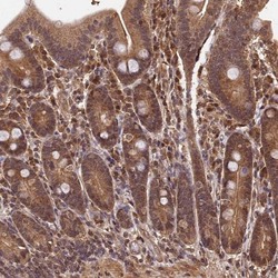 - Immunohistochemical analysis of CEP57L1 in human duodenum using CEP57L1 Polyclonal Antibody (Product # PA5-59153) shows moderate cytoplasmic and nuclear positivity in glandular cells.
