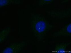 - Immunofluorescent analysis of (-20°C Methanol) fixed HeLa cells using C6orf182 antibody (Product # 24957-1-AP) at dilution of 1:200 and CoraLite®488-Conjugated AffiniPure Goat Anti-Rabbit IgG(H+L).
