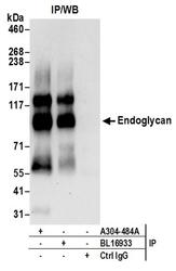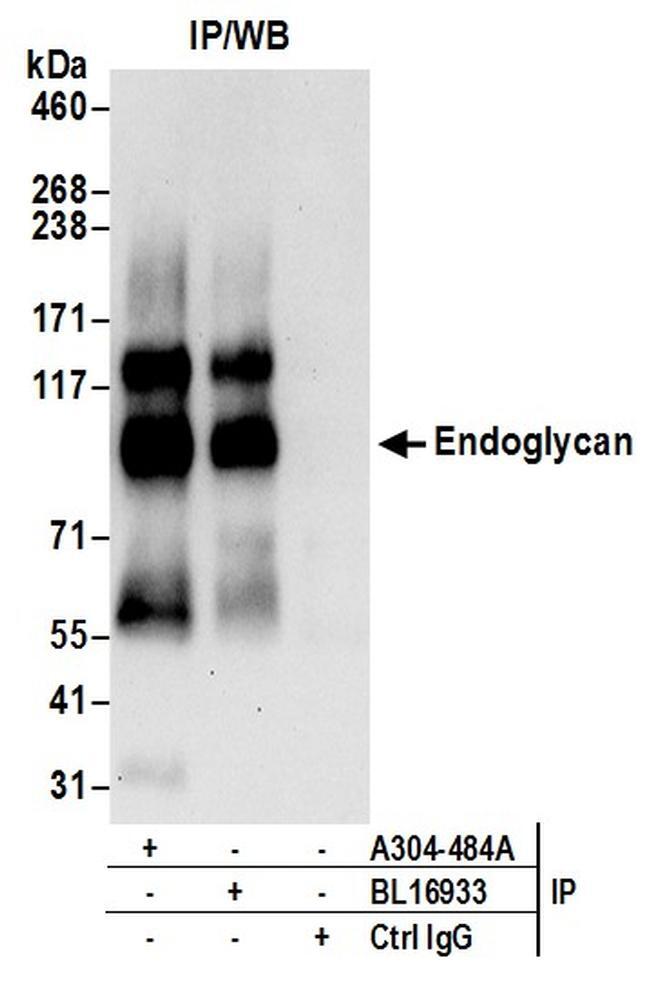 - Detection of human Endoglycan by western blot of immunoprecipitates. Samples: Whole cell lysate (0.5 or 1.0 mg per IP reaction; 20% of IP loaded) from HeLa cells prepared using RIPA lysis buffer. Antibodies: Affinity purified rabbit anti-Endoglycan antibody A304-484A (lot A304-484A-1) used for IP at 6 µg per reaction. Endoglycan was also immunoprecipitated by rabbit anti-Endoglycan antibody BL16933. For blotting immunoprecipitated Endoglycan, A304-484A was used at 1 µg/ml. Detection: Chemiluminescence with an exposure time of 30 seconds.