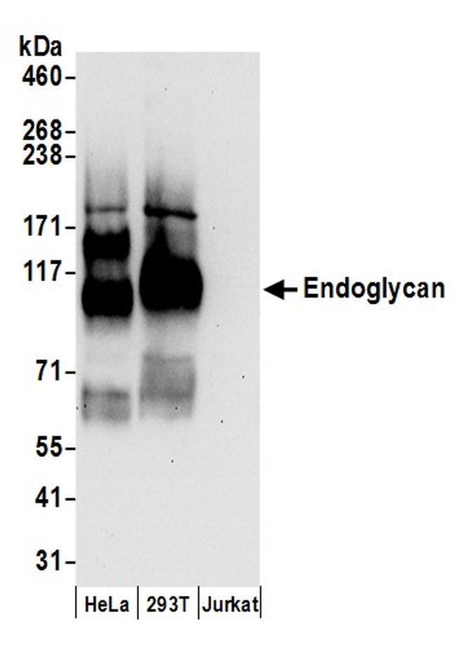 - Detection of human Endoglycan by western blot. Samples: Whole cell lysate (50 µg) from HeLa, 293T, and Jurkat cells prepared using RIPA lysis buffer. Antibodies: Affinity purified rabbit anti-Endoglycan antibody A304-484A (lot A304-484A-1) used for WB at 1 µg/ml. Detection: Chemiluminescence with an exposure time of 30 seconds.