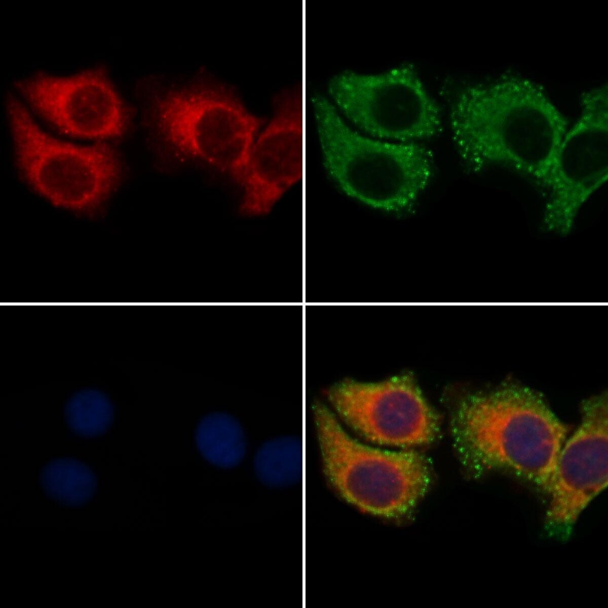 - Immunocytochemistry analysis of ARHGEF19 in Hela cells. The samples were fixed with PFA and permeabilized in 0.1% Triton X-100, then blocked in 10% serum for 45 minutes at 25°C. Samples were incubated with ARHGEF19 polyclonal antibody (Product # PA5-99586) and mouse anti-beta tubulin antibody for 1 hour at 37°C. An AlexaFluor594 conjugated goat anti-rabbit IgG (Red) and an AlexaFluor488 conjugated goat anti-mouse IgG (Green) were used as the secondary antibodies. The nuclear counter stain is DAPI (blue).