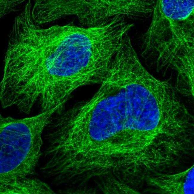- Immunofluorecent analysis of ZDHHC18 in human cell line U-2 OS using ZDHHC18 Polyclonal Antibody (Product # PA5-59114). Staining shows localization to microtubules.
