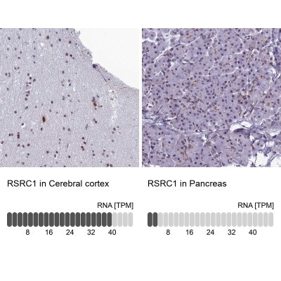 - Immunohistochemistry-Paraffin: RSRC1 Antibody [NBP1-90756] - Staining in human cerebral cortex and pancreas tissues using anti-RSRC1 antibody. Corresponding RSRC1 RNA-seq data are presented for the same tissues.