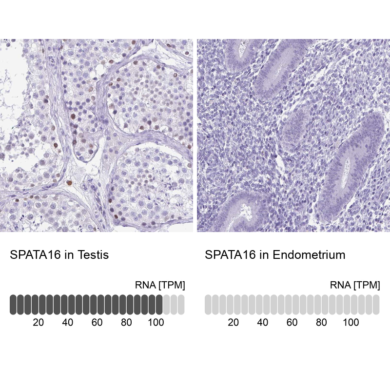 - Immunohistochemistry analysis in human testis and endometrium tissues using Anti-SPATA16 antibody. Corresponding SPATA16 RNA-seq data are presented for the same tissues.
