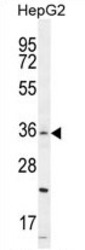 - TPRG1 Antibody (N-term) (AP54346PU-N) western blot analysis in HepG2 cell line lysates (35 µg/lane). This demonstrates the TPRG1 antibody detected the TPRG1 protein (arrow).