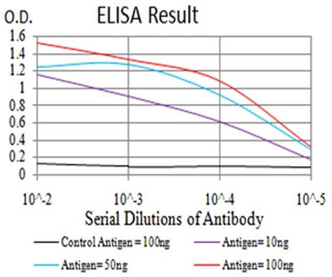- ELISA analysis of eIF5 in Control Antigen (black line, 100 ng); Antigen (purple line, 10 ng); Antigen (blue line, 50 ng); Antigen (red line, 100 ng). Samples were incubated with eIF5 monoclonal antibody (Product # MA5-31726) using a dilution of 1:10,000.