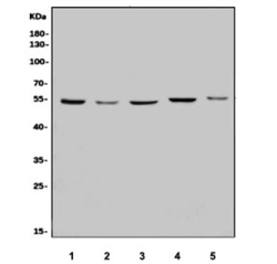 - Western blot testing of human 1) K562, 2) HeLa, 3) HepG2, 4) PC-3 and 5) Caco-2 cell lysate with Eukaryotic translation initiation factor 5 antibody. Predicted molecular weight ~49 kDa.