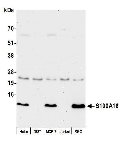 - Detection of human S100A16 by western blot. Samples: Whole cell lysate (50 µg) from HeLa, HEK293T, MCF-7, Jurkat, and RKO cells prepared using NETN lysis buffer. Antibody: Affinity purified rabbit anti-S100A16 antibody (Product # A305-655A-T; lot A305-655A-T-2) used for WB at 1:1000. Detection: Chemiluminescence with an exposure time of 30 seconds.
