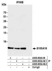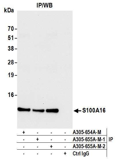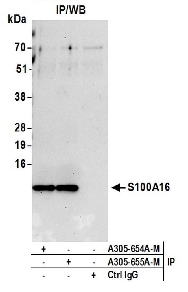 - Detection of human S100A16 by western blot of immunoprecipitates. Samples: Whole cell lysate (0.5 or 1.0 mg per IP reaction; 20% of IP loaded) from HeLa cells prepared using NETN lysis buffer. Antibodies: Affinity purified rabbit anti-S100A16 antibody A305-655A-M (lot A305-655A-M-1) used for IP at 20 µl per reaction. S100A16 was also immunoprecipitated by rabbit anti-S100A16 antibody A305-654A-M. For blotting immunoprecipitated S100A16, A305-655A-M was used at 1:100. Detection: Chemiluminescence with an exposure time of 30 seconds.