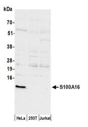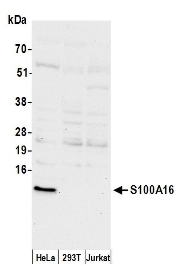 - Detection of human S100A16 by western blot. Samples: Whole cell lysate (50 µg) from HeLa, 293T, and Jurkat cells prepared using NETN lysis buffer. Antibody: Affinity purified rabbit anti-S100A16 antibody A305-655A-M (lot A305-655A-M-1) used for WB at 1:1000. Detection: Chemiluminescence with an exposure time of 30 seconds.
