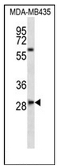 - Western blot analysis of SLAMF8 Antibody (C-term) ??in MDA-MB435 cell line lysates (35ug/lane). This demonstrates the SLAMF8 antibody detected the SLAMF8 protein (arrow).