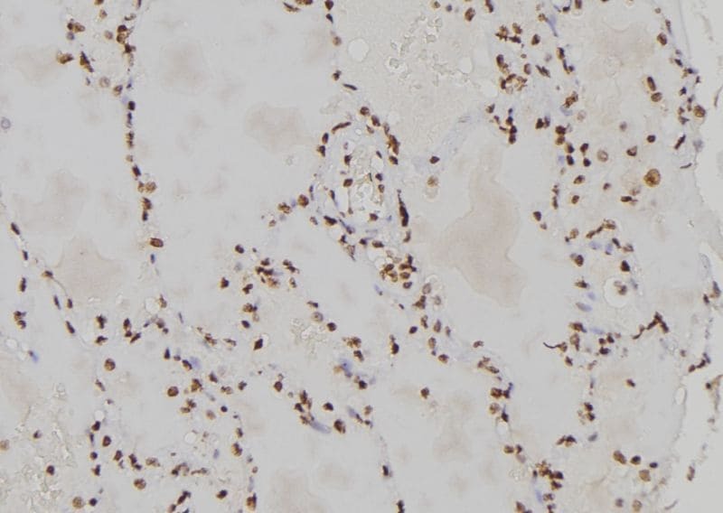 - Immunohistochemistry analysis of paraffin-embedded CENPL in human lung tissue. Antigen retrieval was performed using citrate buffer. Samples were blocked with blocking buffer (1.5 hr, 22°C), incubated with CENPL polyclonal antibody (Product # PA5-100719) using a dilution of 1:100 (1.5 hr, 22°C), followed by HRP conjugated goat anti-rabbit.
