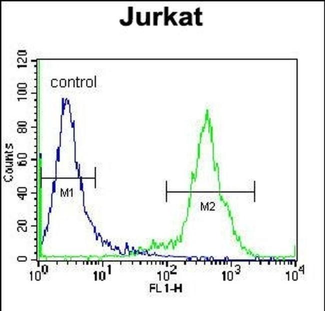 - Flow cytometry analysis of ZNF648 in Jurkat cells (right histogram) compared to a negative control cell (left histogram). Samples were incubated with ZNF648 polyclonal antibody (Product # PA5-71532) followed by a FITC conjugated donkey anti-rabbit secondary antibody.