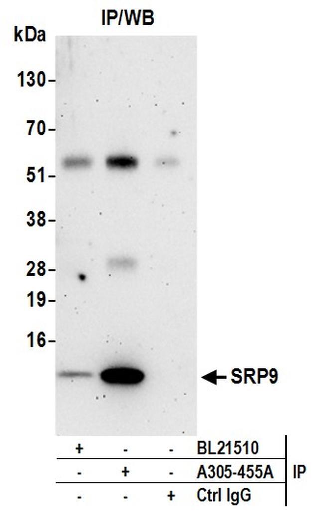 - Detection of human SRP9 by western blot of immunoprecipitates. Samples: Whole cell lysate (0.5 or 1.0 mg per IP reaction; 20% of IP loaded) from 293T cells prepared using NETN lysis buffer. Antibodies: Affinity purified rabbit anti-SRP9 antibody A305-455A (lot A305-455A-1) used for IP at 6 µg per reaction. SRP9 was also immunoprecipitated by rabbit anti-SRP9 antibody BL21510. For blotting immunoprecipitated SRP9, A305-455A was used at 1 µg/ml. Detection: Chemiluminescence with an exposure time of 3 minutes.