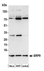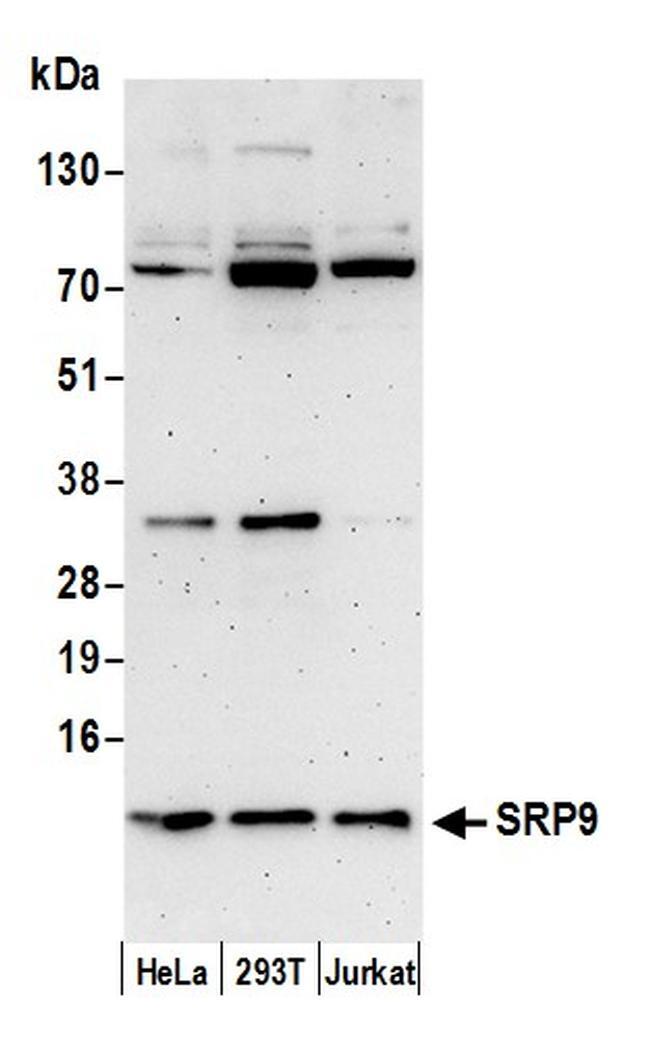 - Detection of human SRP9 by western blot. Samples: Whole cell lysate (15 µg) from HeLa, 293T, and Jurkat cells prepared using NETN lysis buffer. Antibody: Affinity purified rabbit anti-SRP9 antibody A305-455A (lot A305-455A-1) used for WB at 0.1 µg/ml. Detection: Chemiluminescence with an exposure time of 3 minutes.