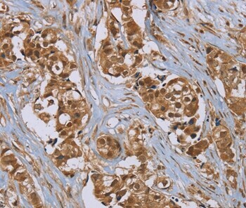 - Immunohistochemical analysis of PUS10 in paraffin embedded Human breast cancer tissue using PUS10 Polyclonal Antibody (Product # PA5-50738) at a 1:45 dilution.