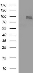 - HEK293T cells were transfected with the pCMV6-ENTRY control (Left lane) or pCMV6-ENTRY CEP68 (RC200798, Right lane) cDNA for 48 hrs and lysed. Equivalent amounts of cell lysates (5 µg per lane) were separated by SDS-PAGE and immunoblotted with anti-CEP68. Positive lysates LY414743 (100 µg) and LC414743 (20 µg) can be purchased separately from OriGene.