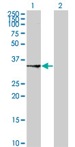 - Western Blot analysis of SUCLG1 expression in transfected 293T cell line by SUCLG1 polyclonal antibody (A01).Lane1:SUCLG1 transfected lysate(35.047 KDa).Lane2:Non-transfected lysate.