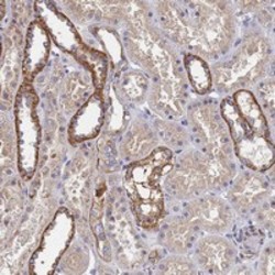 - Immunohistochemical staining of human kidney with KRCC1 polyclonal antibody (Cat # PAB24435) shows strong cytoplasmic and positivity in cells in tubules at 1:50-1:200 dilution.