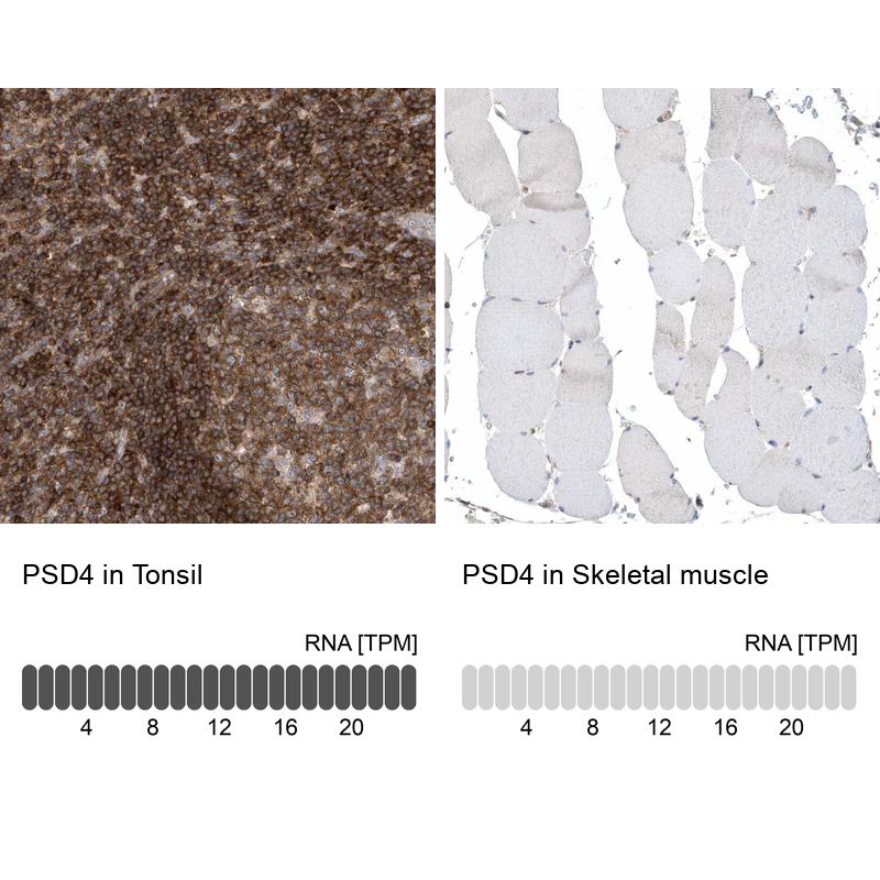 - Immunohistochemistry analysis in human tonsil and skeletal muscle tissues using Anti-PSD4 antibody. Corresponding PSD4 RNA-seq data are presented for the same tissues.
