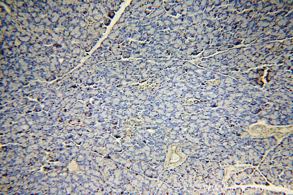 - Immunohistochemistry of paraffin-embedded human pancreas using 19758-1-AP (SFT2D3 antibody) at dilution of 1:50 (under 10x lens).