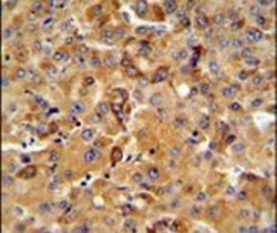 - Immunohistochemistry analysis in formalin-fixed, paraffin-embedded human hepatocarcinoma using a SFT2D3 polyclonal antibody (Product # PA5-25192), followed by HRP-conjugated secondary antibody and DAB staining.