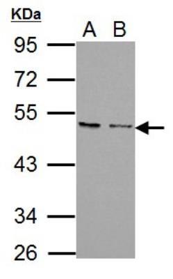 - Western Blot: CXCR7/RDC-1 Antibody [NBP1-31309] - Whole cell extract (30 ug) was separated by 10% SDS-PAGE, and the membrane was blotted with CXCR7 antibody [C1C2], Internal diluted at 1:500. The HRP-conjugated anti-rabbit IgG antibody (NBP2-19301) was used to detect the primary antibody.