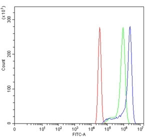 - Flow cytometry testing of human SiHa cells with CXCR7 antibody at 1ug/million cells (blocked with goat sera); Red=cells alone, Green=isotype control, Blue= CXCR7 antibody.