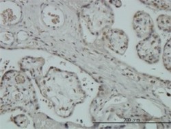 - Immunohistochemistry-Paraffin: ZNF345 Antibody (6G10) [H00025850-M01] - Analysis of monoclonal antibody to ZNF345 on formalin-fixed paraffin-embedded human placenta. Antibody concentration 3 ug/ml.