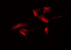 - Immunofluorescent analysis of SH2D5 in 293 cells. Samples were fixed with paraformaldehyde, permeabilized with 0.1% Triton X-100, blocked with 10% serum (45 min at 25°C) incubated with SH2D5 polyclonal antibody (Product # PA5-101883) using a dilution of 1:200 (1 hr, 37°C), and followed by goat anti-rabbit IgG Alexa Fluor 594 at a dilution of 1:600.
