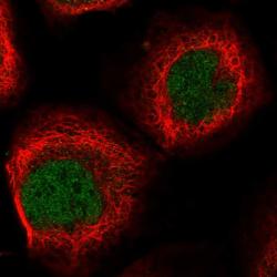- Immunofluorescent staining of human cell line A-431 shows localization to nucleoplasm.