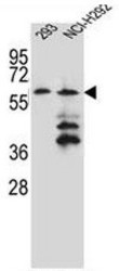- PRAMEF12 Antibody (Center) western blot analysis in 293,NCI-H292 cell line lysates (35ug/lane).This demonstrates the PRAMEF12 antibody detected the PRAMEF12 protein (arrow).