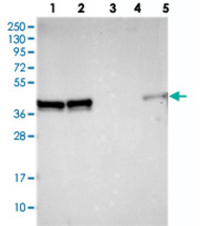 - Western blot analysis of Lane 1: RT-4, Lane 2: U-251 MG, Lane 3: Human Plasma, Lane 4: Liver, Lane 5: Tonsil with PRAMEF12 polyclonal antibody (Cat # PAB24097) at 1:250-1:500 dilution.