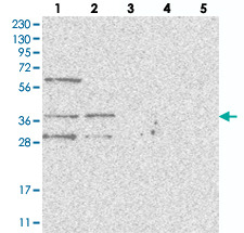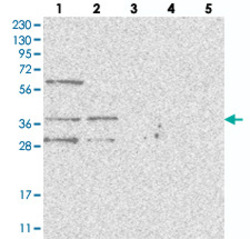 - Western blot analysis of Lane 1: RT-4, Lane 2: U-251 MG, Lane 3: Human Plasma, Lane 4: Liver, Lane 5: Tonsil with WDR92 polyclonal antibody (Cat # PAB27846) at 1:100-1:250 dilution.