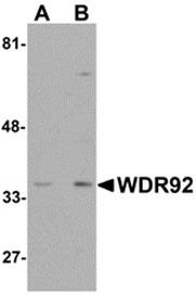 - Western blot analysis of WDR92 in human kidney tissue lysate with WDR92 antibody at (A) 1 and (B) 2 μg/ml.