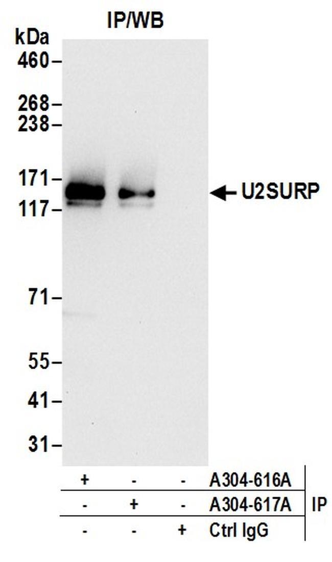 - Detection of human U2SURP by western blot of immunoprecipitates. Samples: Whole cell lysate (0.5 or 1.0 mg per IP reaction; 20% of IP loaded) from 293T cells prepared using NETN lysis buffer. Antibodies: Affinity purified rabbit anti-U2SURP antibody A304-616A (lot A304-616A-1) used for IP at 6 µg per reaction. U2SURP was also immunoprecipitated by rabbit anti-U2SURP antibody A304-617A. For blotting immunoprecipitated U2SURP, A304-616A was used at 0.1 µg/ml. Detection: Chemiluminescence with an exposure time of 10 seconds.