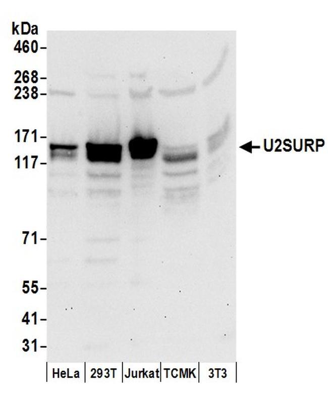 - Detection of human and mouse U2SURP by western blot. Samples: Whole cell lysate (50 µg) from HeLa, 293T, Jurkat, mouse TCMK-1, and mouse NIH3T3 cells prepared using NETN lysis buffer. Antibodies: Affinity purified rabbit anti-U2SURP antibody A304-616A (lot A304-616A-1) used for WB at 0.1 µg/ml. Detection: Chemiluminescence with an exposure time of 30 seconds.