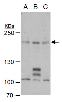 - PCF11 antibody detects PCF11 protein by western blot analysis.A. 30 £gg 293T whole cell extractB. 30 £gg A431 whole cell extractC. 30 £gg HeLa whole cell extract5 % SDS-PAGEPCF11 antibody (GTX120962) dilution: 1:500