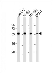 - All lanes: Anti-GMCL1 Antibody (Center) at 1:2000 dilution. Lane 1: 293T/17 whole cell lysate. Lane 2: HL-60 whole cell lysate. Lane 3: mouse testis lysate. Lane 4: MCF-7 whole cell lysate Lysates/proteins at 20 ug per lane. Secondary Goat Anti-Rabbit IgG, (H+L), Peroxidase conjugated at 1:10000 dilution. Predicted band size: 59 kDa. Blocking/Dilution buffer: 5% NFDM/TBST.