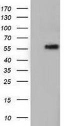 - HEK293T cells were transfected with the pCMV6-ENTRY control (Left lane) or pCMV6-ENTRY TCP11L2 (Right lane) cDNA for 48 hrs and lysed. Equivalent amounts of cell lysates (5 ug per lane) were separated by SDS-PAGE and immunoblotted with anti-TCP11L2.