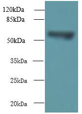 - Western blot All lanes: TCP11L2 antibody at 1µg/ml + A549 whole cell lysate Secondary Goat polyclonal to rabbit IgG at 1/10000 dilution Predicted band size: 59, 30 kDa Observed band size: 59 kDa