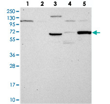 - Western blot analysis of Lane 1: RT-4, Lane 2: U-251 MG, Lane 3: Human Plasma, Lane 4: Liver, Lane 5: Tonsil with TCP11L2 polyclonal antibody (Cat # PAB23549).