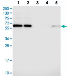- Western blot analysis of Lane 1: RT-4, Lane 2: U-251 MG, Lane 3: Human Plasma, Lane 4: Liver, Lane 5: Tonsil with TCP11L2 polyclonal antibody (Cat # PAB23911) at 1:250-1:500 dilution.