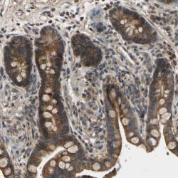 - Immunohistochemical staining of human colon shows distinct cytoplasmic positivity in glandular cells.