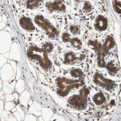 - Immunohistochemical staining of human breast shows strong cytoplasmic positivity in glandular cells.