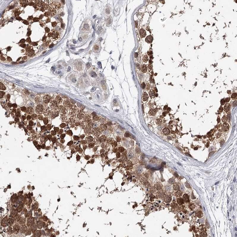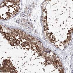 - Immunohistochemical analysis of GTSF1 in human Testis using GTSF1 Polyclonal Antibody (Product # PA5-58575) shows strong cytoplasmic and nuclear positivity in cells in seminiferous ducts.