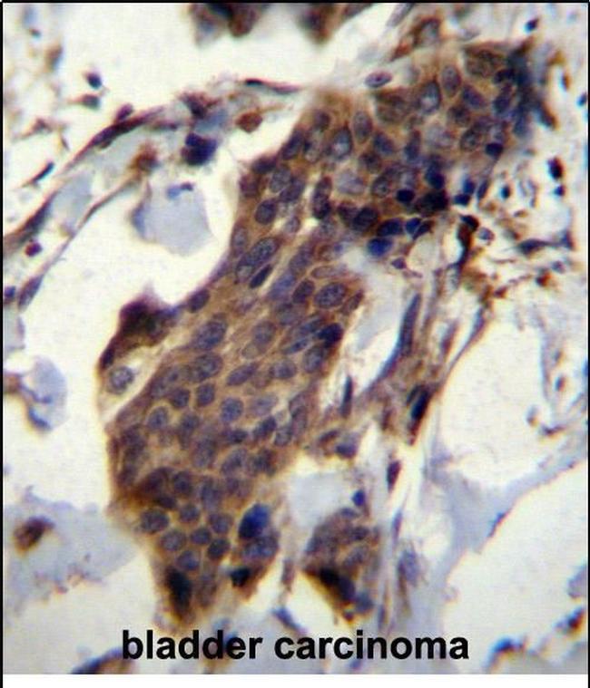- Immunohistochemical analysis of CCDC13 in formalin fixed and paraffin embedded human bladder carcinoma tissue. Samples were probed with a CCDC13 Antibody (N-term) (Product # PA5-48421) followed by peroxidase conjugation of the secondary antibody and DAB staining.