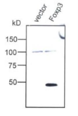 - Western Blot: FoxP3 Antibody [NB100-39002] - Jurkat Tag cells were transfected with the expression vector (vector) or with the Foxp3 expression construct (Foxp3). 24 hours after transfection, cells were lysed and analyzed by Western blot with anti-Foxp3 antiserum (1:2000 dilution).